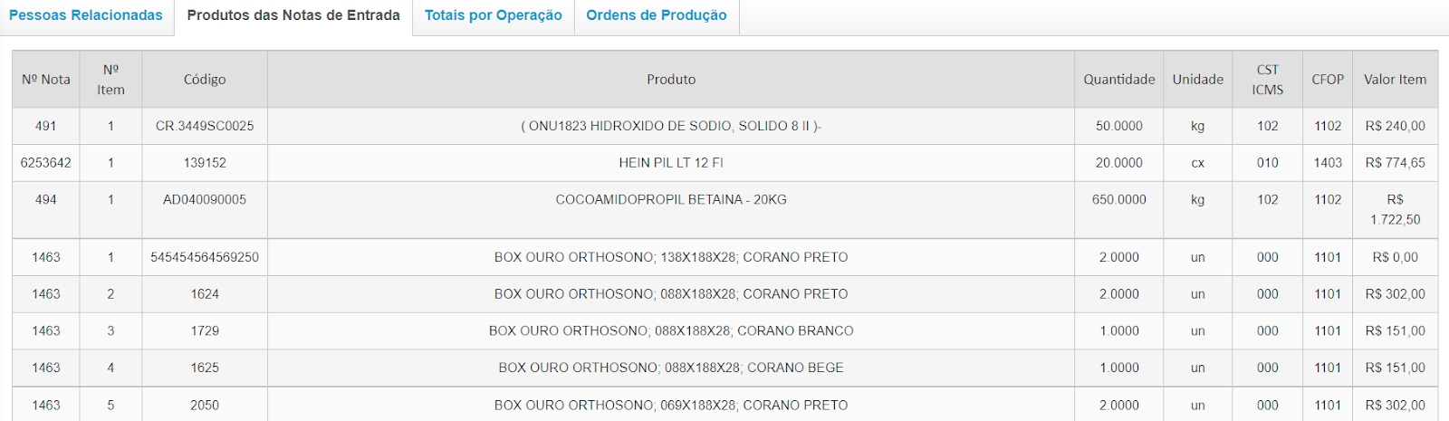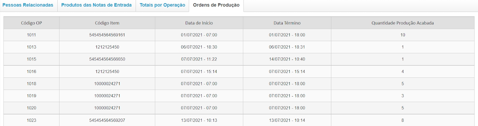 Nesta aba serão informados os produtos em que passaram por alguma Ordem de Produção.