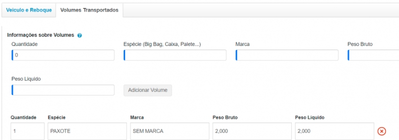 Feito isso, clique no botão Adicionar. Além disso, será necessário informar os campos na aba Volumes Transportados. Feito isso, clique no botão Adicionar Volume.
