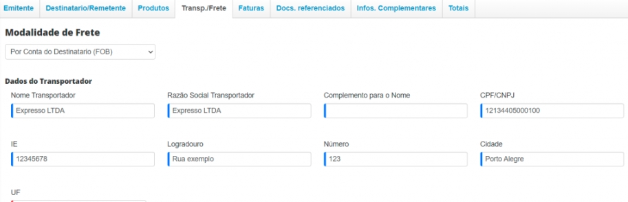 Inicialmente você deverá escolher qual Modalidade de Frete melhor se aplica para a nota em questão. Após selecionar uma opção para o transporte, deverão ser preenchidos também os Dados do Transportador.