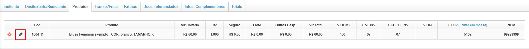 Agora, já no painel de edição da nota, vá até a aba Produtos e edite o produto desejado, clicando no ícone de lápis.