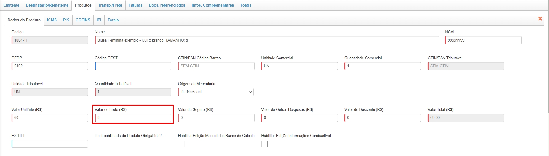 ⚠️ Importante! Caso você tenha mais de um produto na nota fiscal, você pode inserir o valor total do frete em apenas um deles, ou então, dividir manualmente o valor do frete entre eles.