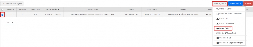 Assim, o sistema apresentará a sua NFC-e. Basta selecioná-la e em Mais Ações, clicar na opção Baixar DANFE.