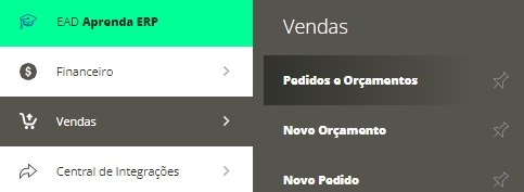 Acesse o menu lateral Vendas, submenu Pedidos e Orçamentos.