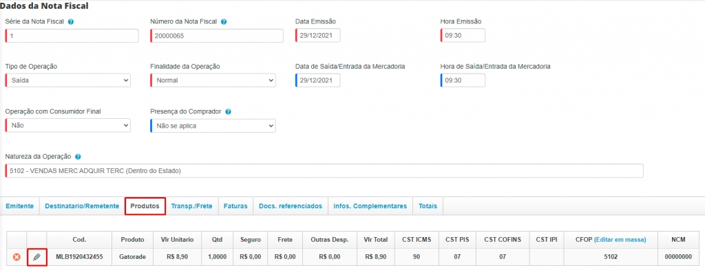 Para corrigir esse erro, você deverá acessar sua nota fiscal e abrir a aba Produtos. E em seguida, clique no ícone de lápis para Editar o produto.