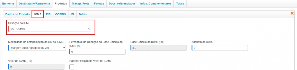 Agora, na aba ICMS, você deverá alterar a situação selecionada no campo Situação do ICMS. Você deverá selecionar uma situação que seja para o Simples Nacional.
