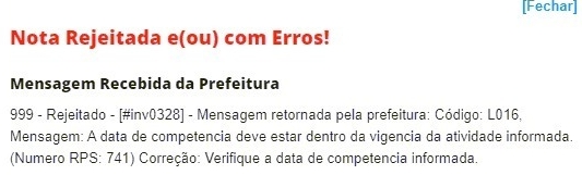 A data de competência deve estar dentro da vigência da atividade informada.(Numero RPS: 56) Correção: Verifique a data de competência informada.