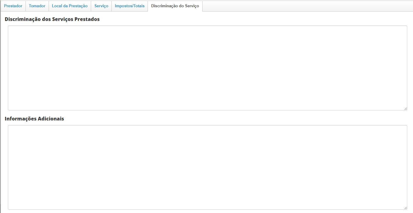 Nesta seção você poderá informar observações que devem aparecer na NFS-e. Para informar um texto padrão para todas as notas de serviço, preencha o campo Informação Complementar Padrão NFS-e dentro do cadastro base de sua empresa emissora das notas.