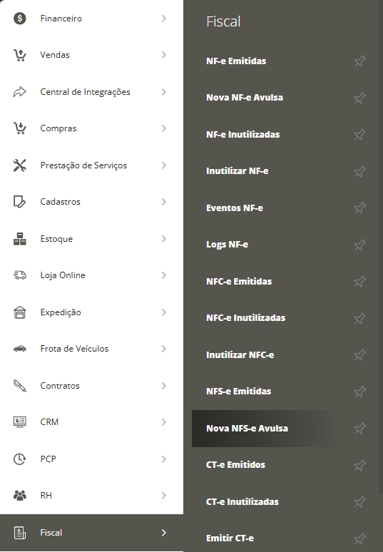 Acesse Menu Lateral Fiscal e em seguida Submenu Nova NFS-e Avulsa