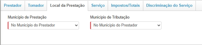 Município de Prestação: selecione em qual município o serviço foi prestado; Município de Tributação: selecione em qual município será cobrada a tributação;