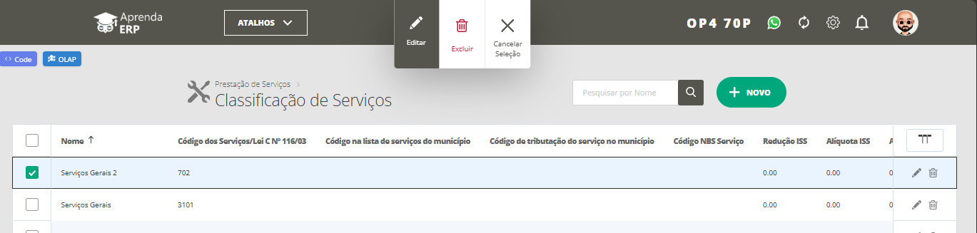 Ao editar a classificação, é necessário estar verificar as informações preenchidas nos seguintes campos: Código na lista de serviços do município e Código de trib. do serv. no município