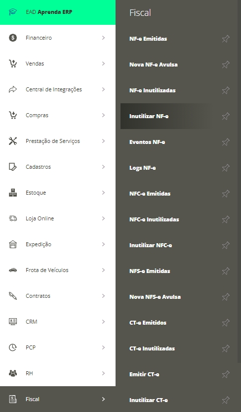 - Para inutilizar outros modelos de nota, como NF-e, NFC-e e CT-e, basta acessar o menu lateral Fiscal e localizar o submenu correspondente ao modelo da nota que deseja inutilizar;