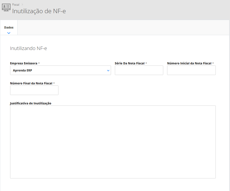 Para isso, acesse o menu lateral Fiscal, submenu Inutilizar NF-e.
