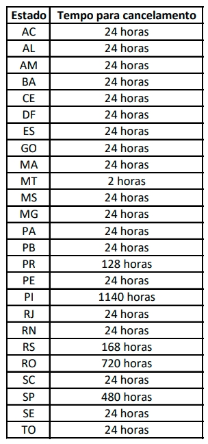Consulte na tabela abaixo qual o prazo de cancelamento de cada região.