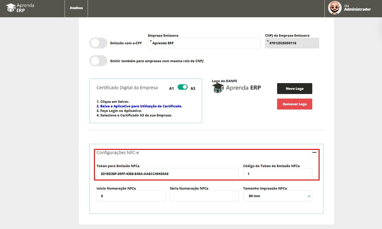 Código Token NFC-e: composto por um código numérico ou seja, somente números