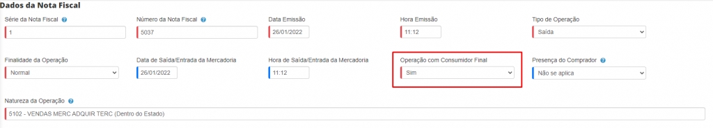 Em seguida, no campo Operação com Consumidor Final, você deverá seleciona a opção Sim.