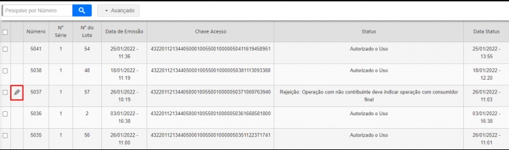 Porém, caso você consultar nesses sites e não aparecer a IE, essa pessoa realmente é um consumidor final. Dessa forma, você terá que editar sua NF-e e configurá-la com essa informação. Para isso, acesse o menu lateral Fiscal, submenu NF-e Emitidas e edite a sua NF-e que está com esta rejeição