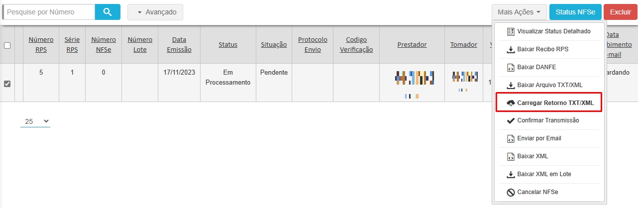 Ao selecionar a nota, clique em Mais Ações e em seguida Carregar Retorno TXT/XML