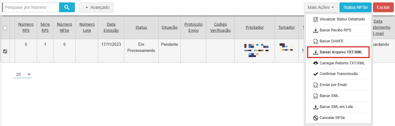 Ao selecionar a nota, clique em Mais Ações e em seguida Baixar arquivo TXT/XML