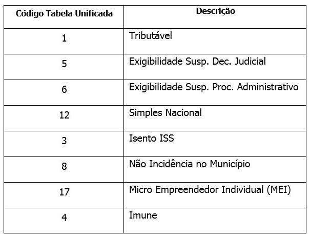 Tabela com as opções de Natureza da Operação aceitas pela pelo sistema DATAPUBLIC: