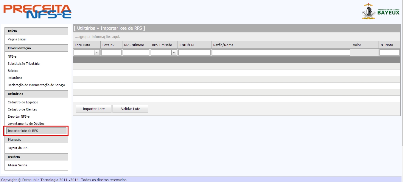 Após a geração do arquivo TXT contendo o RPS, é necessário acessar o sistema web da prefeitura e realizar o upload do mesmo. Para isso deve-se primeiramente validar o arquivo, acessando o validador através do menu “UTILITÁRIOS => Importar Lote de RPS”, onde o usuário é redirecionado para a seguinte tela: