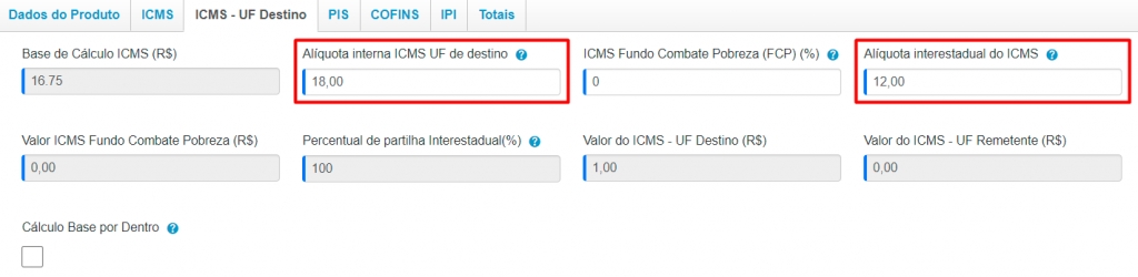 No campo Alíquota interna ICMS UF de destino, você deverá inserir a alíquota referente ao seu estado (Origem RS – Destino RS). Neste exemplo, conforme a Tabela DIFAL, a alíquota é de 18%.