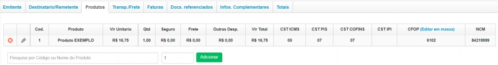 Após preencher todos esses dados na nota fiscal, é o momento de inserir quais os produtos estão sendo utilizados. Portanto, acesse a aba Produtos e adicione os produtos desejados. Lembre-se de inserir o CFOP que foi adicionado na Natureza de Operação, referente a operação fora do estado, clicando na opção Editar em massa.