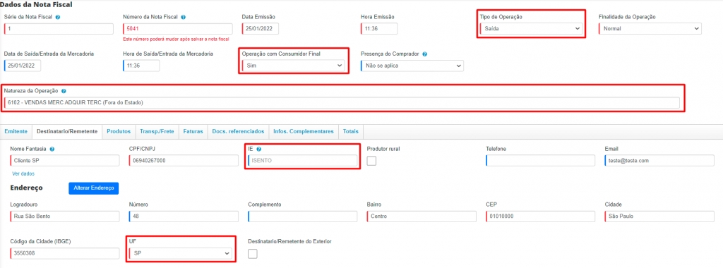 No Sistema ERP, ao emitir a NF-e através de uma venda ou de forma avulsa, a tela de edição da nota deverá ficar com os seguintes dados: