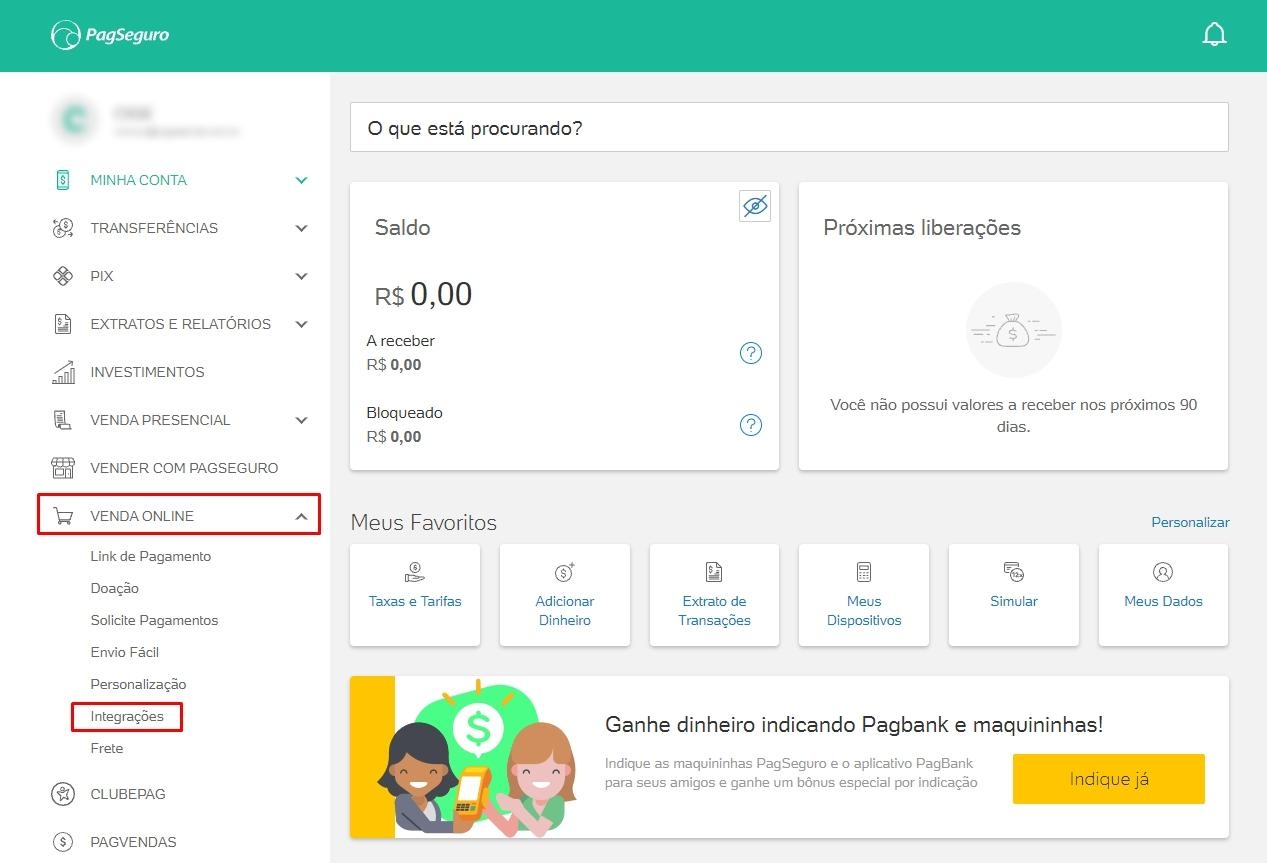 Acesse a sua conta PagSeguro, na tela principal, clique em Venda Online e em seguida em Integrações.