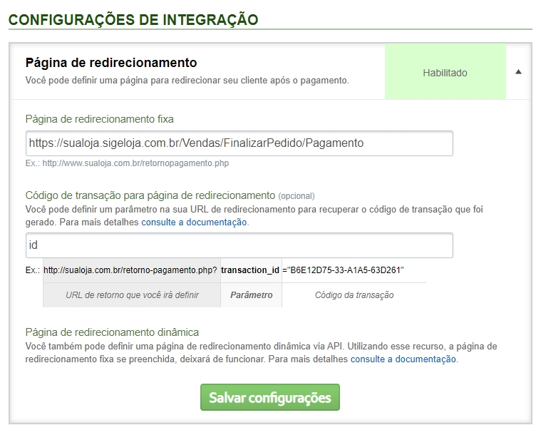Agora, você precisará informar a URL da sua Loja Online no momento do pagamento no campo Página de redirecionamento fixa. Informe também o Código da transação para a página de redirecionamento(entre em contato com a pagseguro para geração do ID)e após isto, clique em Salvar Configurações.