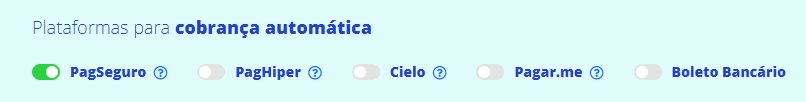 O sistema abrirá diversas opções de plataformas de cobrança automática, selecione a PagSeguro.