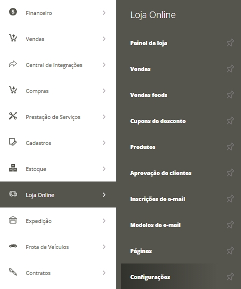 Com o Token salvo, estando no Sistema ERP, acesse o menu lateral Loja Online, submenu Configurações.