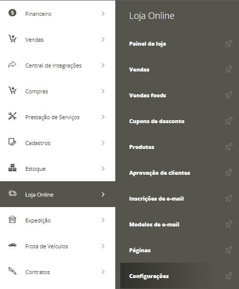 Com a sua conta habilitada, você precisará acessar o menu lateral Loja Online, submenu Configurações.