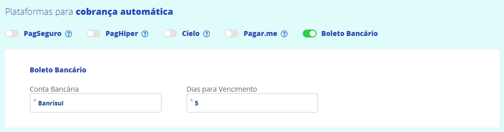 Agora, na aba de Configurações, em Plataformas para cobrança automática, selecione Boleto Bancário. Neste momento, será necessário preencher os seguintes campos: