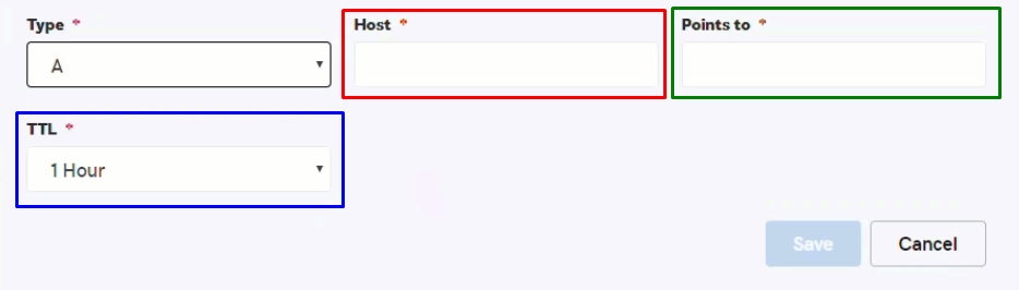 - Selecione CNAMEno campo Type. 2. Adicione o nome do subdomínio no campo destacado em vermelho. Por exemplo: www.loja. 3. No campo Points todestacado em verde, adicione seu domíniodomínio.com.br. 4. No campo TTL, selecione1 Hour. Agora, basta clicar em Save.