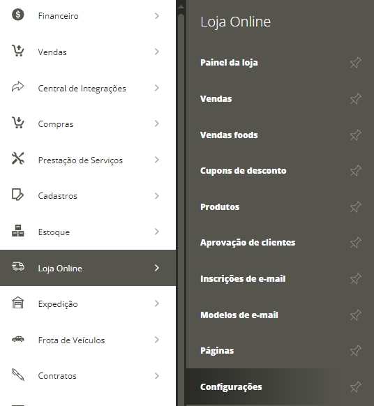 Acessando Menu Lateral Loja Online e em seguida Submenu Configurações