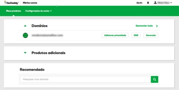 1- Acesse sua conta GoDaddy e clique em Meus Produtos, na seção Domínios, selecione o domínio desejado e clique em DNS.