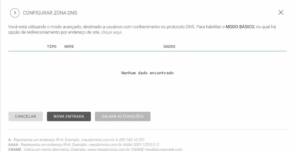 Atenção: Caso você ainda não tenha realizado nenhuma edição de Zona de DNS em seu domínio, será preciso clicar no botão "Modo Avançadas" e aguardar até 15 minutos para que seja disponibilizada tal opção para editar a entrada CNAME.