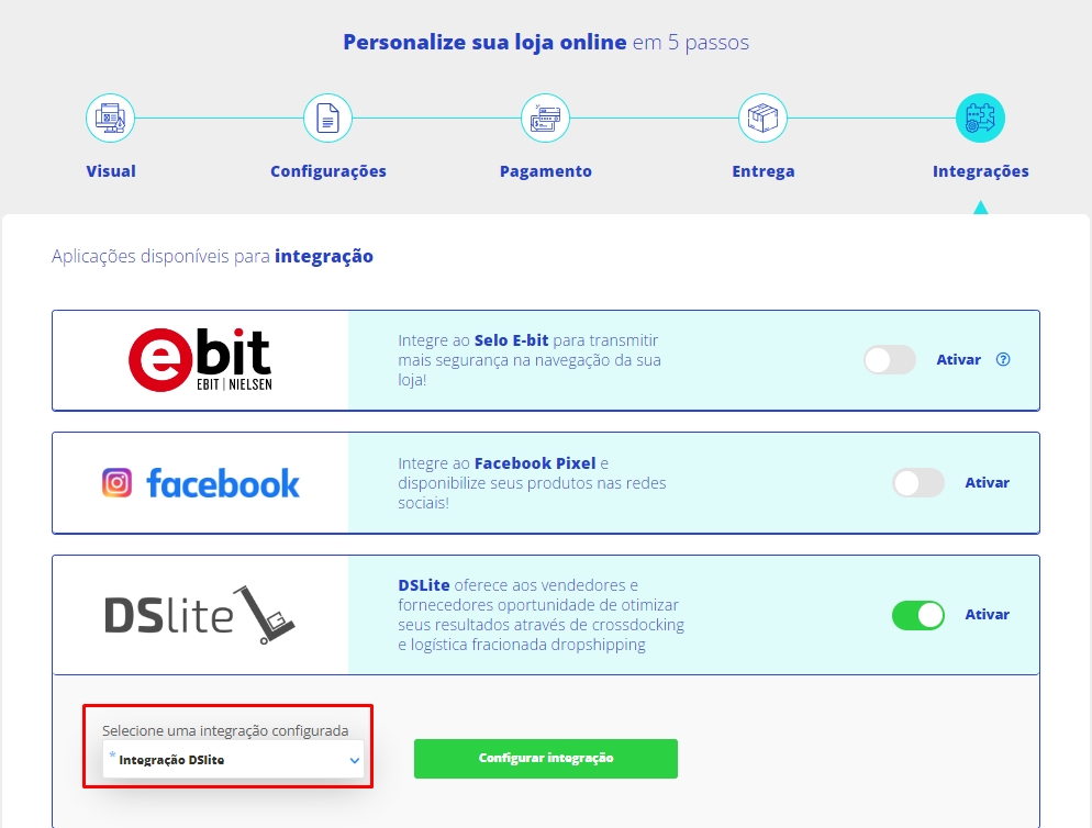 Neste momento, localize a integração via DSLite e clique em Ativar. Após, Selecione uma integração configurada e clique em Salvar no topo da tela.