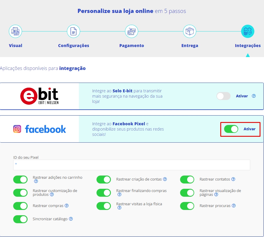 Agora, no campo Facebook Pixel, clique em Ativar e em seguida, cole o pixel gerado no Facebook.