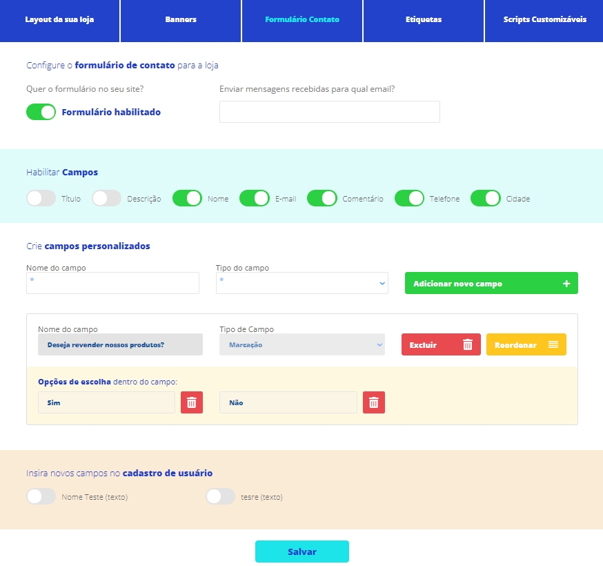 Quer o formulário no seu site?: marque o checkbox para Formulário Habilitado, caso deseje solicitar alguns dados aos usuários do seu site;