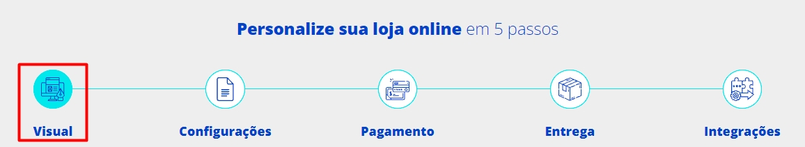 Em seguida, você será direcionado para a tela de configuração da sua loja virtual, onde já estará na seção Visual. É sobre todo este módulo Visual que iremos informar neste artigo.