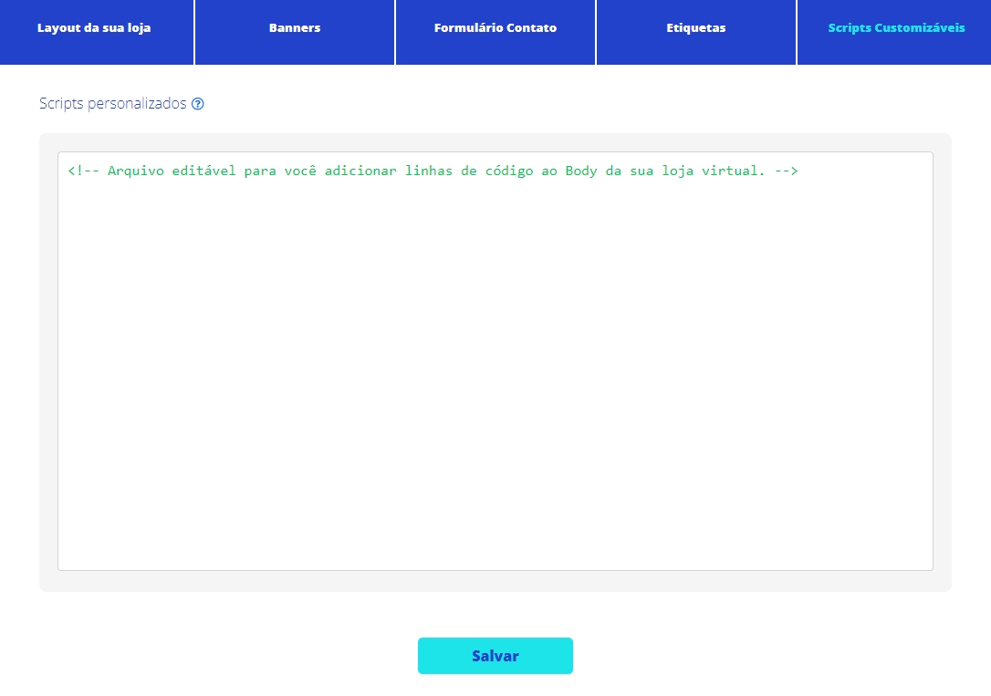 O último passo para finalizar a configuração visual da Loja Online são os Scripts Customizáveis. Neste campo, você poderá informar o script de aplicativos externos para que seja realizada uma conexão e você possa implementar a sua loja. Com a configuração dos scripts, você poderá verificar analiticamente dados sobre sua loja virtual. Um dos exemplos de configuração de script é com o Google Analytics.
