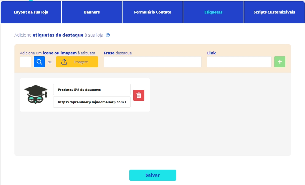 Feito isso, clique em Salvar. Assim, quando o seu cliente clicar na etiqueta ele será direcionado para a página do link que você informou.