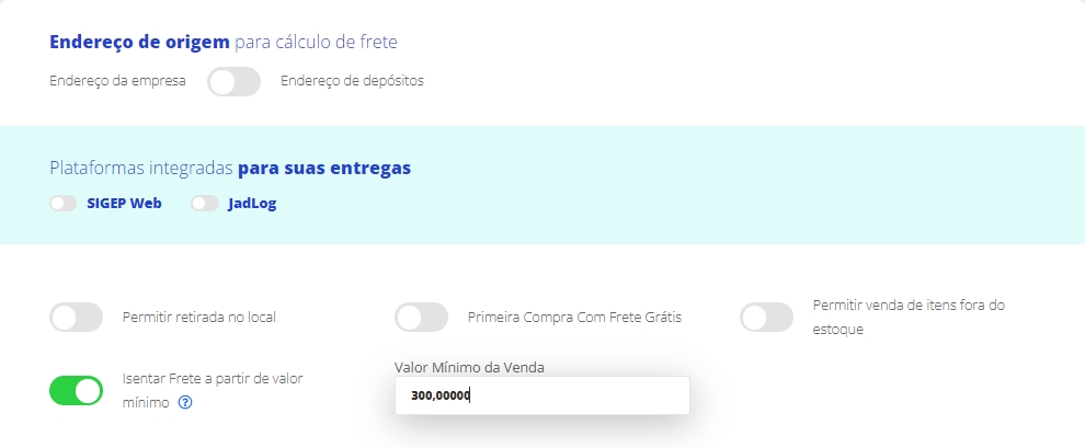 Para isentar o frete do seu cliente a partir de um valor, você deverá marcar a opção Isentar Frete a partir de valor mínimo. Assim, o sistema abrirá um novo campo para informar o valor desejado da compra, assim o cliente terá este benefício.