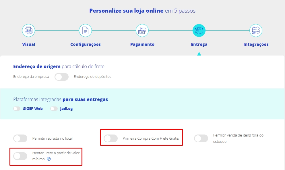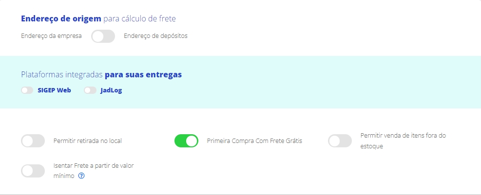 Acesse a aba Entregas. Você poderá isentar o frete de duas formas, na primeira compra do cliente ou a partir de um valor mínimo de venda.