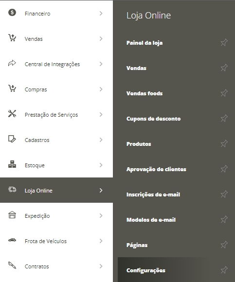 Se você deseja informar as redes sociais da sua loja em seu site, basta acessar o menu lateral Loja Online, submenu Configurações.