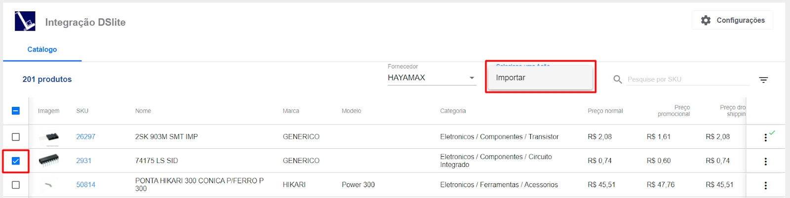 Após aplicar o filtro, será exibida a listagem de produtos, onde será possível selecionar o produto e em seguida, clicar em Selecione uma Ação e selecionar a opção Importar.