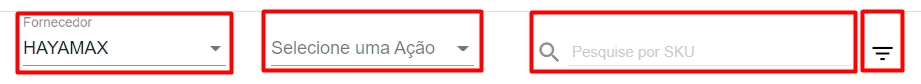 No campo Fornecedor, é possível que você selecione o fornecedor que deseja, e também será possível buscar determinado produto pela Pesquisa por SKU, ou então utilizando o Filtro Avançado.