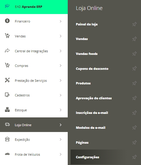 Por fim, de acordo com a forma de pagamento informada pelo cliente no momento de finalização da compra, o pedido é informado no Sistema ERP com o status de “pedido faturado” ou “pedido”. Em caso de ser “pedido”, é possível que você informe alguma categoria de venda [](https://aprendaerp.gitbook.io/central-de-ajuda-aprenda-erp/%7E/changes/zUCG4ibUh0Ge5B62740I/cadastros-basicos/cadastros-basicos/como-cadastrar-categorias-de-venda-para-operacoes-fiscais-no-sistema-erp)que não movimente o estoque. Porém, caso estiver com o status de “pedido faturado”, por padrão, será informada a Categoria De Venda Padrão que foi configurada na Loja Online, podendo ou não realizar movimentações no seu estoque.