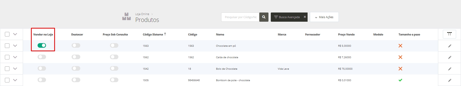 Assim que o produto estiver criado no Sistema ERP, será possível você enviá-lo para a Loja Online. Dessa forma, acesse o menu lateral Loja Online, submenu Produtos.